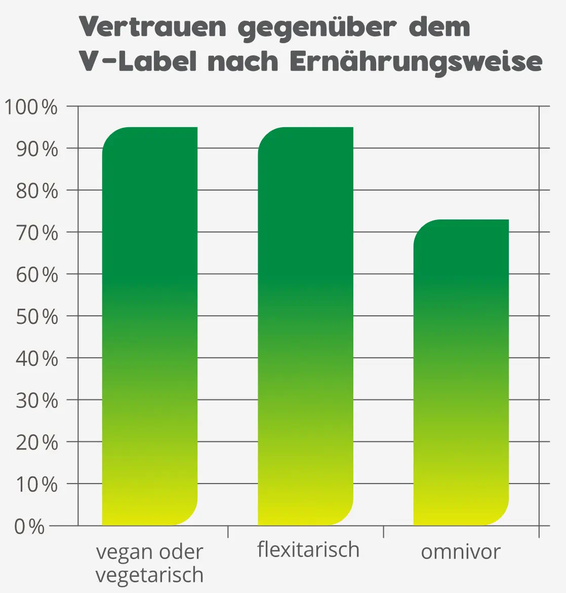 Das V-Label ist mittlerweile das bekannteste und vertrauenswürdigste vegetarische und vegane Label – weltweit wie auch in der Schweiz. Heute tragen weltweit über 70'000 Produkte von 4'800 Unternehmen das V-Label. Aktuell sind 7’077 Produkte von 255 Unternehmen in der Schweiz und in Liechtenstein durch Swissveg lizenziert. Konsumenten und Konsumentinnen verbinden das V-Label mit Vertrauen, Qualität und Gesundheit. Inzwischen kennen über zwei Drittel (68 %) der Schweizer Gesamtbevölkerung das Label, Tendenz weiter steigend.1 95 % der Zielgruppe (flexitarisch, vegetarisch, vegan) vertrauen dem V-Label, 95 % der Konsumenten und Konsumentinnen fühlen sich dadurch besser informiert und 88 % empfinden, dass es das Einkaufen erleichtert.1, 2
