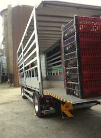 Eine prägende Tätigkeit war für mich sicherlich das sogenannte Ausstallen. So half ich mit, die mittlerweile auf 4'100 dezimierten Hühner in Kisten zu packen. Um die Hühner nicht allzu sehr zu verängstigen, geschah das Ganze im Halbdunkel. Und schon ging es los, keine Zeit für moralische Bedenken: Mit Gummihandschuhen ausgerüstet, packte ich ein erstes Huhn. Es war ganz warm, glühte förmlich. Es fühlte sich auch irgendwie schwammig und gebrechlich an. Nach und nach wurde ich geschickter, packte eines nach dem anderen in die Kisten, insgesamt 15 Hühner pro Kiste. Meine routinierten Mitausstaller packten jeweils zwei auf einmal, ich hatte schon mit einem Huhn Mühe. Dabei war es heiss und die Feuchtigkeit im Stall hoch. Als sich dann alle Hühner in den Kisten befanden, war ich bachnass und richtig ausgelaugt. Doch es ging weiter. Fünf Kisten mussten jeweils übereinander auf eine Palette aufgereiht werden, so dass diese mit dem Traktor in den Lastwagen gehievt werden konnte. So erwarteten die Tiere einen «One-way-Trip» zum Schlachthof in Zell LU.