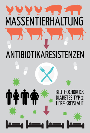 Die Tierhaltung steht am Anfang und am Ende der Pandemien: Sie sind die häufigste Quelle für gefährliche Krankheitskeime und die Tierhaltung fördert Antibiotikaresistenzen. Eine Reduktion des Konsums tierischer Produkte hätte auf allen Ebenen Vorteile: