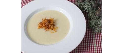 Sellerieknollen und Kartoffeln mit dem Sparschäler schälen, dabei alle dunklen Teile (Augen) entfernen und in grobe Stücke schneiden.Zwei Stücke vom Sellerie für das Gemüsestroh aufheben. Zwiebel schälen und würfeln. In der Margarine 5 Minuten andünsten und mit der Hälfte der Bouillon ablöschen. Gemüse zugeben und kochen, bis es weich ist.