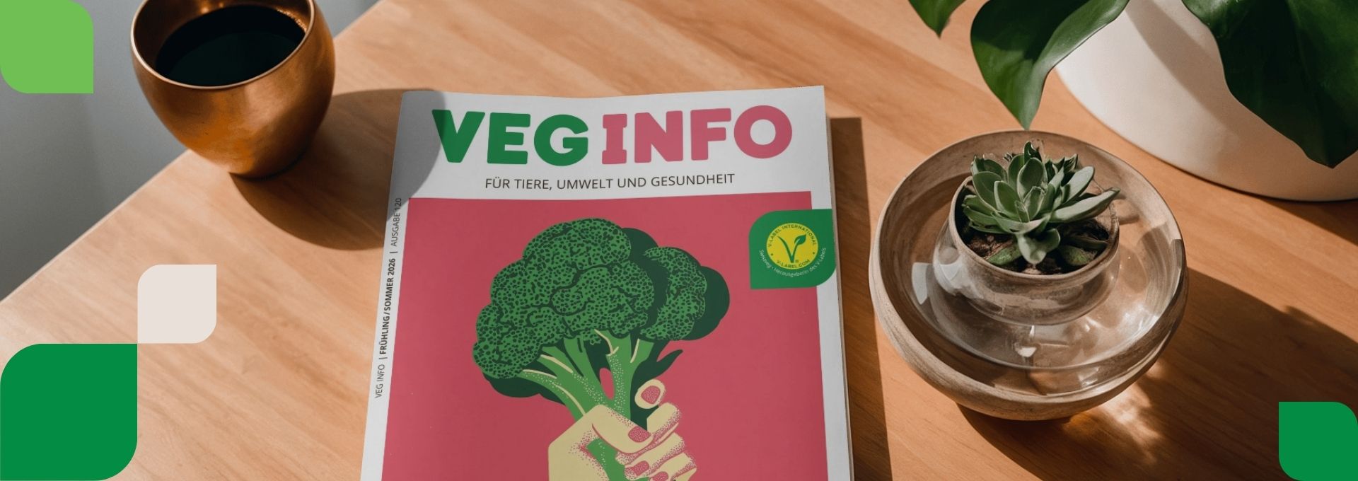 Veg Info ist die einzige Schweizer Zeitschrift für alle Vegetarier, Veganer und Interessierte – seit 1996. Halbjährlich werden darin exklusiv recherchierte Fachartikel veröffentlicht, mit dem Know-How von über 30 Jahren Erfahrung auf diesem Gebiet. Ausserdem natürlich abwechslungsreiche Rezepte, Buchvorstellungen, V-Label-News und Hintergrundberichte zu den Menschen und Organisationen, die hinter der veganen Lebensweise stehen. Das Magazin wird klimaneutral hergestellt und in der Schweiz gedruckt.
