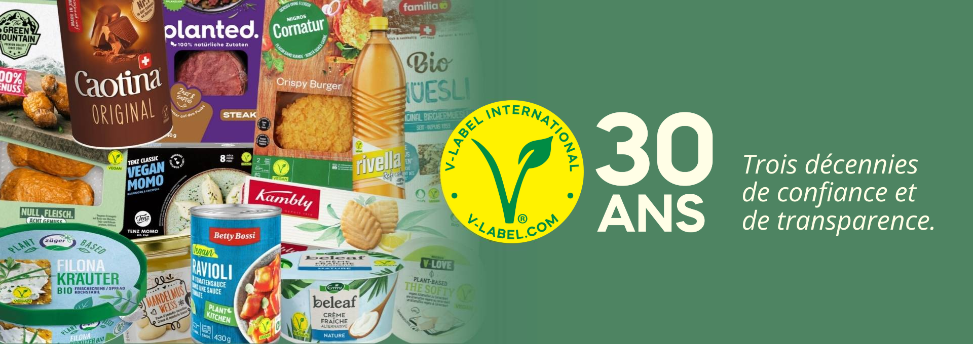 En 2026, le V-Label fête son 30ᵉ anniversaire. Fondé par Swissveg en 1996, il est désormais devenu le label végé-végane le plus connu et le plus fiable du monde. Il existe aujourd’hui plus de 70 000 produits certifiés V-Label, commercialisés par plus de 4800 entreprises dans plus de 55 pays.